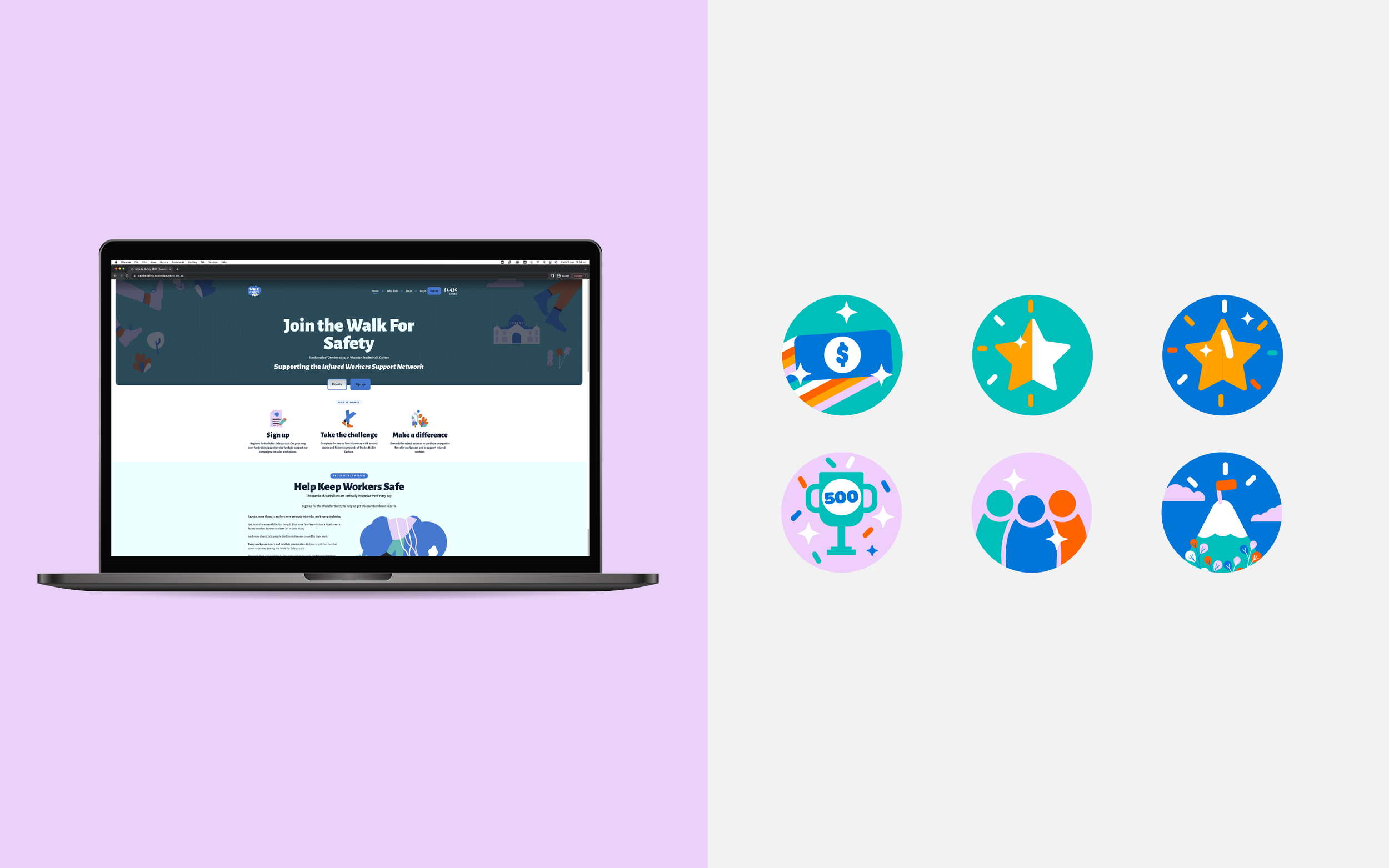Event branding and web assets for Walk for Safety, a charity walk raising money to support injured workers and campaign for stronger work health safety laws.